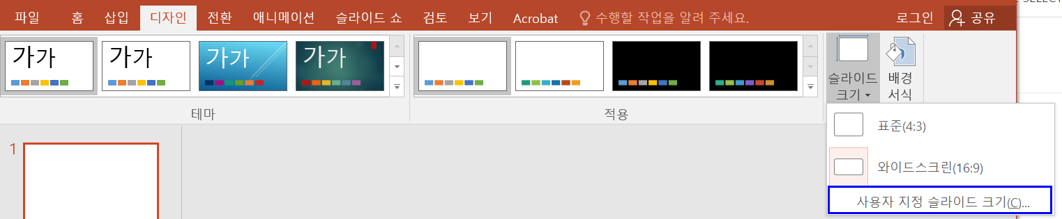 만약 원하는 비율이 없다면, 아래의 사진처럼 '사용자 지정 슬라이드 크기'를 선택해주세요.