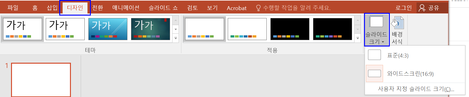 디자인 > 슬라이드 크기 > 원하는 비율 선택