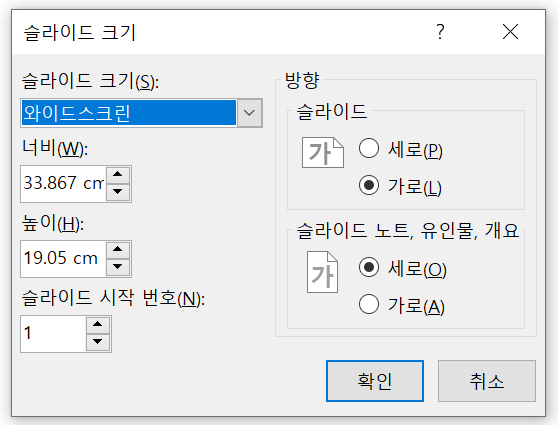 이 창에서 슬라이드 크기를 마음대로 조절할 수 있고, 슬라이드의 방향도 가로, 세로로 자유롭게 변경할 수 있어요.
