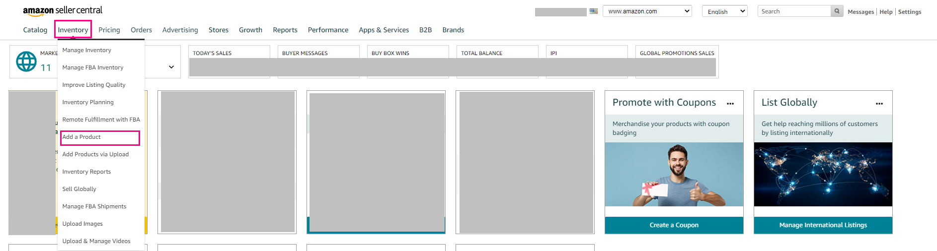 Amazon seller central에 로그인한 후, 판매상품을 등록할 국가를 선택하여 입장합니다.