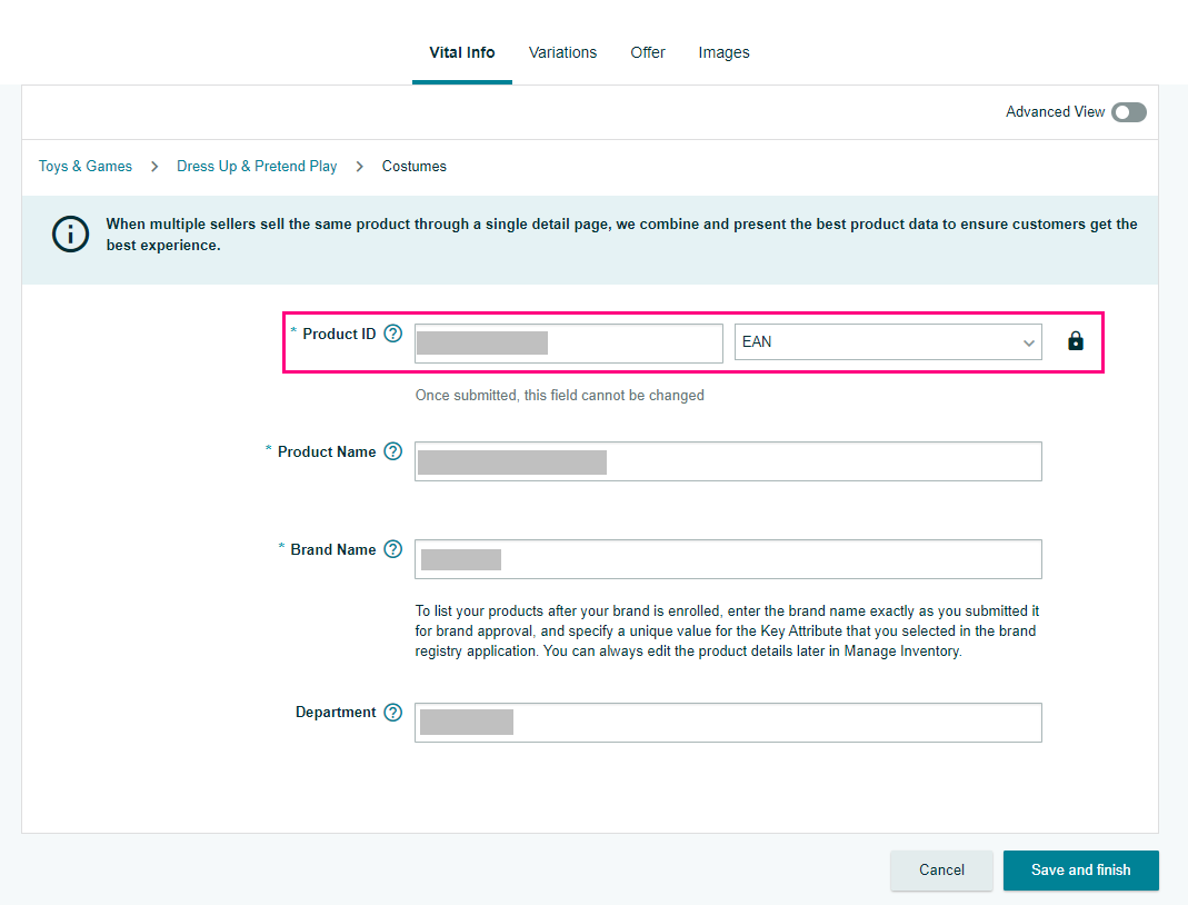 그리고 나머지 필수 입력 칸인 Product Name을 입력해야 합니다. 저는 아마존에 소유한 Brand를 등록한 Brand Owner이기 때문에 Brand Name이 필수 입력 칸이지만, Brand를 등록하지 않은 첫 상품등록 시에는 Brand 칸은 비워두면 됩니다.