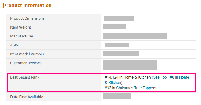여기서 해당 상품의 카테고리를 알 수 있습니다. Best Sellers Rank란, 해당 상품의 카테고리 내에서 판매 순위입니다. # 다음에 나오는 숫자 '14,124'는 랭킹이고, in 다음에 나오는 'Home & Kitchen'은 상위 카테고리입니다. "#32 in Christmas Tree Toppers"는 하위 카테고리에서의 랭킹입니다.