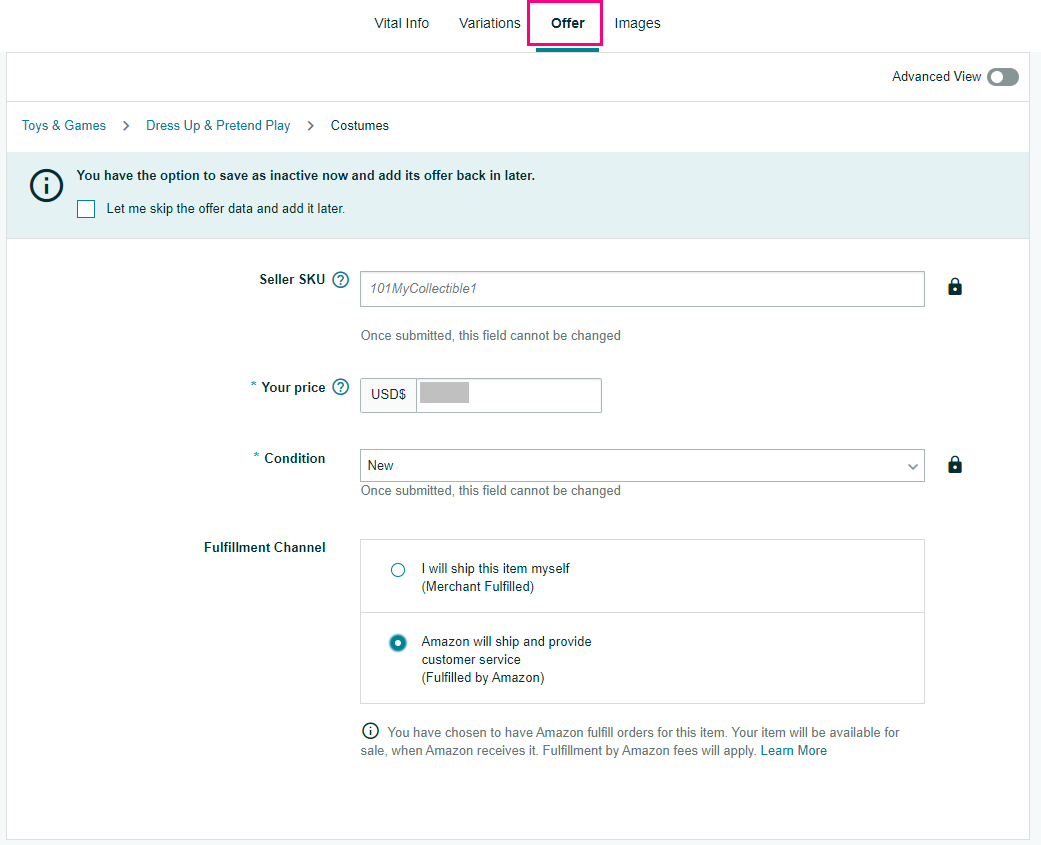 다음으로 Offer를 선택하여 판매가, 배송 방법 등을 작성해야 합니다.