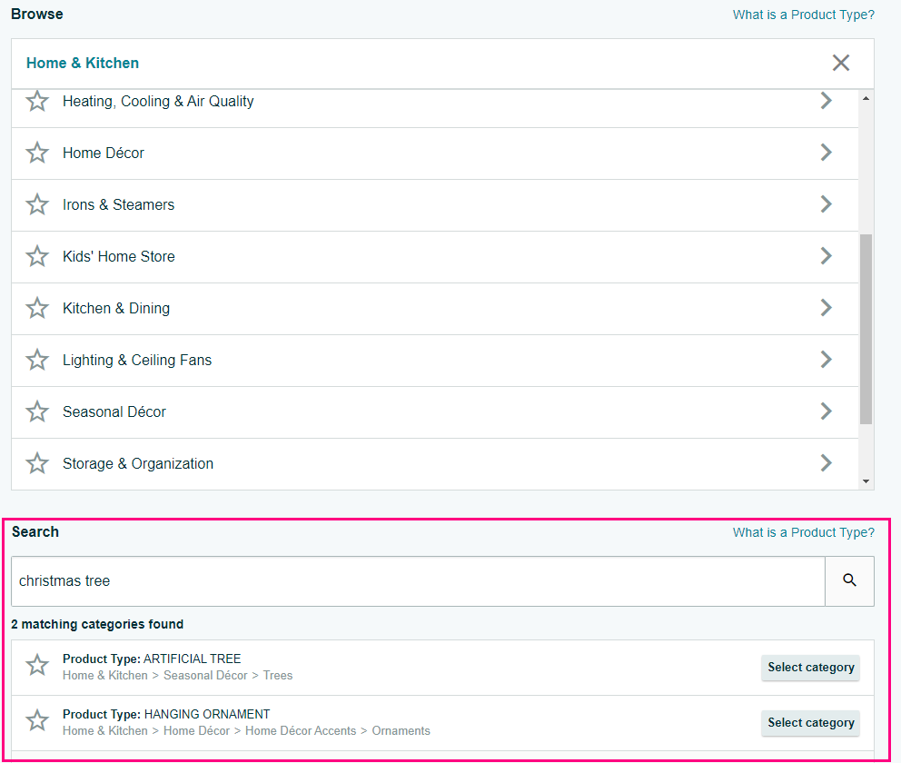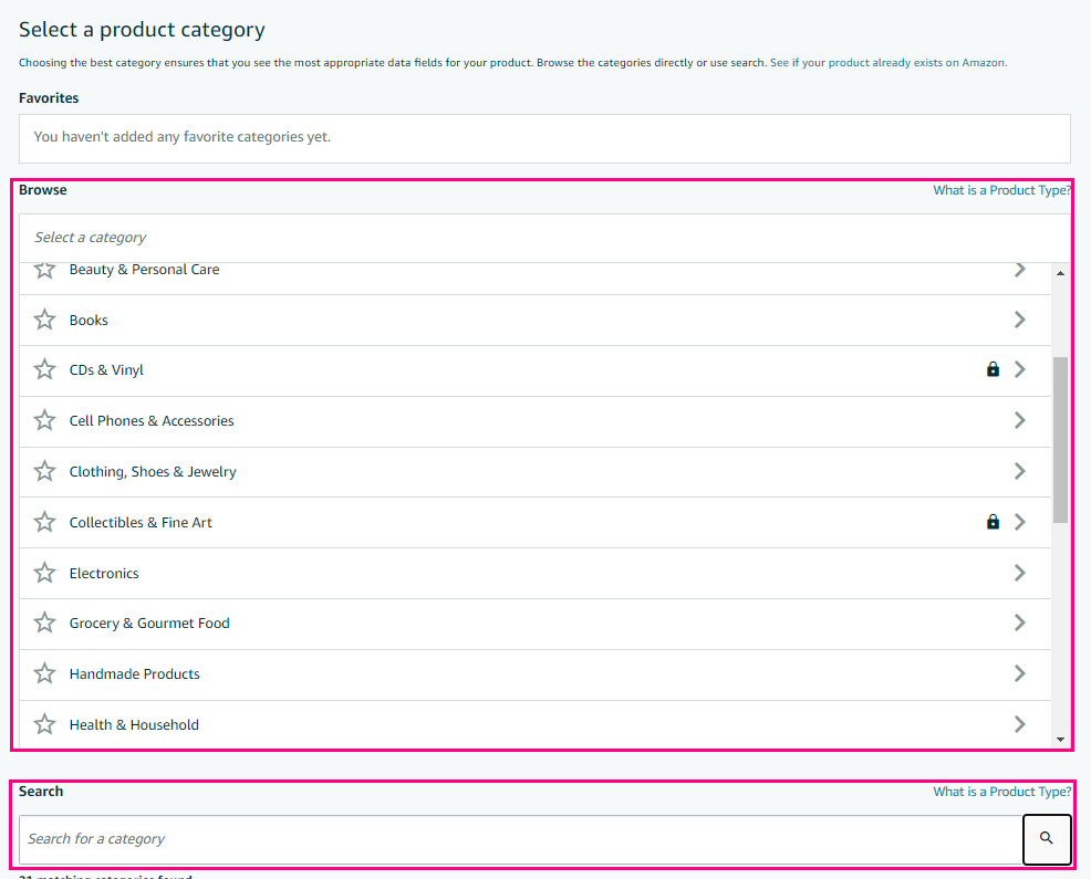 Browse의 하단에 있는 상위 카테고리부터 적합한 카테고리를 클릭하여 하위 카테고리를 선택할 수 있어요. 만약, 내가 판매할 상품의 상위 카테고리를 모르겠다면, Search에 하위 카테고리를 입력하면 아마존 내에서 해당 하위 카테고리의 상위 카테고리를 보여줍니다.