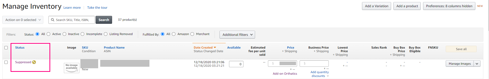상품등록이 제대로 완료되었다면 Status에 Inactive(out of stock)이 되어야 합니다. 재고만 없을 뿐, 판매가 가능한 상태라는 겁니다. Suppressed는 상품등록에 문제가 있다는 것입니다.