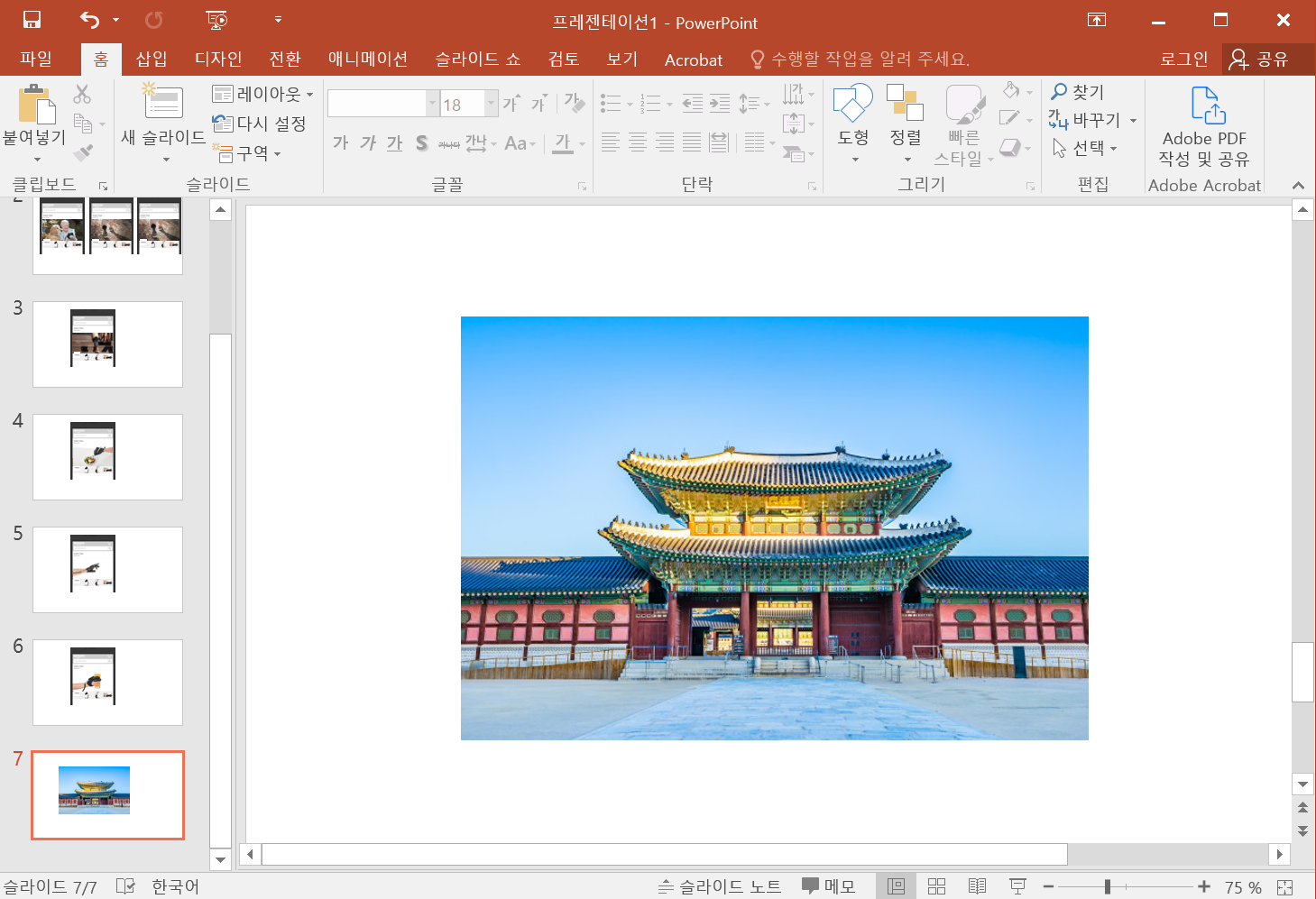 사진 위에 있는 도형을 연하게 하였으므로, 사진과 도형을 그룹(Ctrl + G)시키면 사진 투명도 조절은 완료되었습니다.