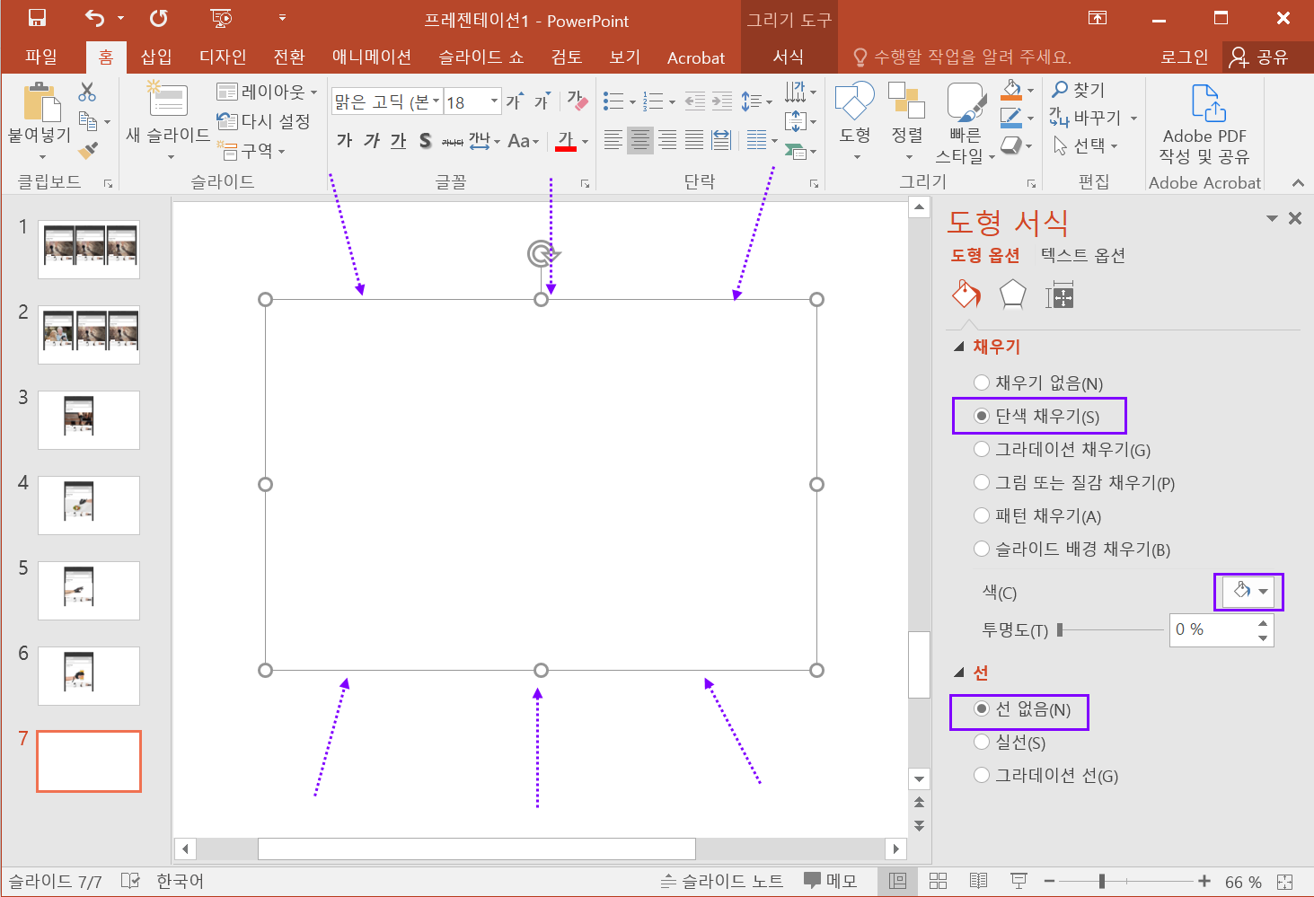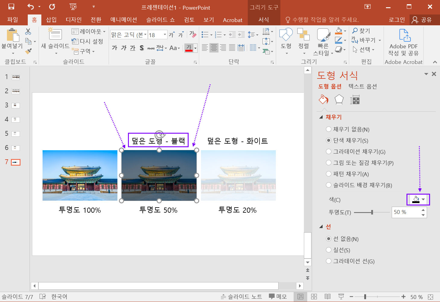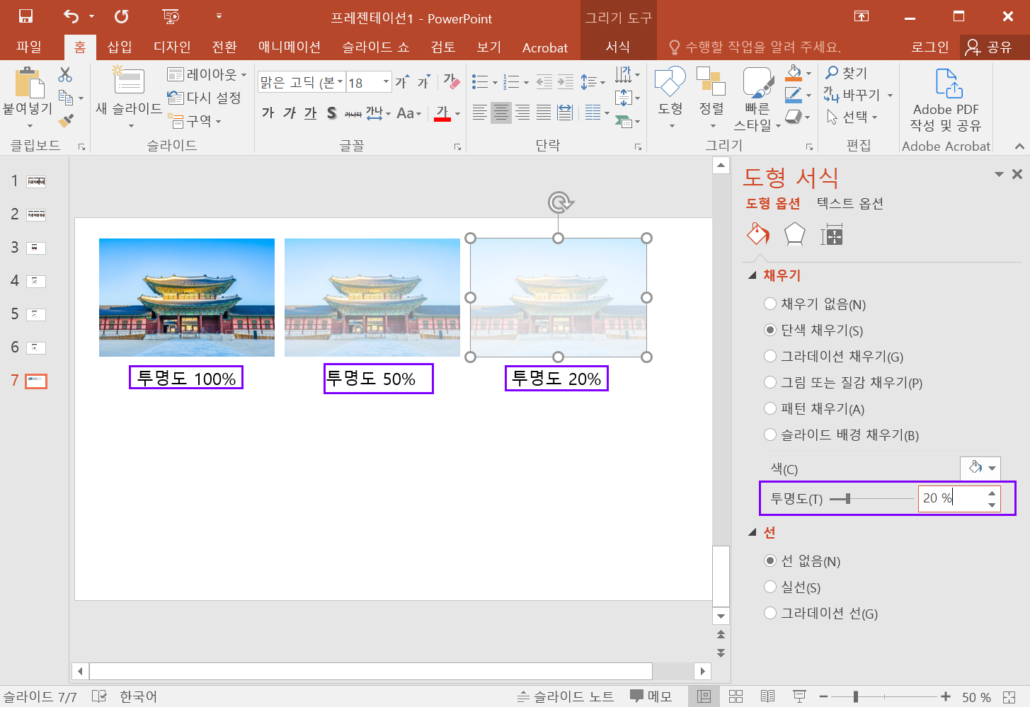 100% : 도형이 완전히 투명하므로 사진은 원본과 같이 선명하게 보임