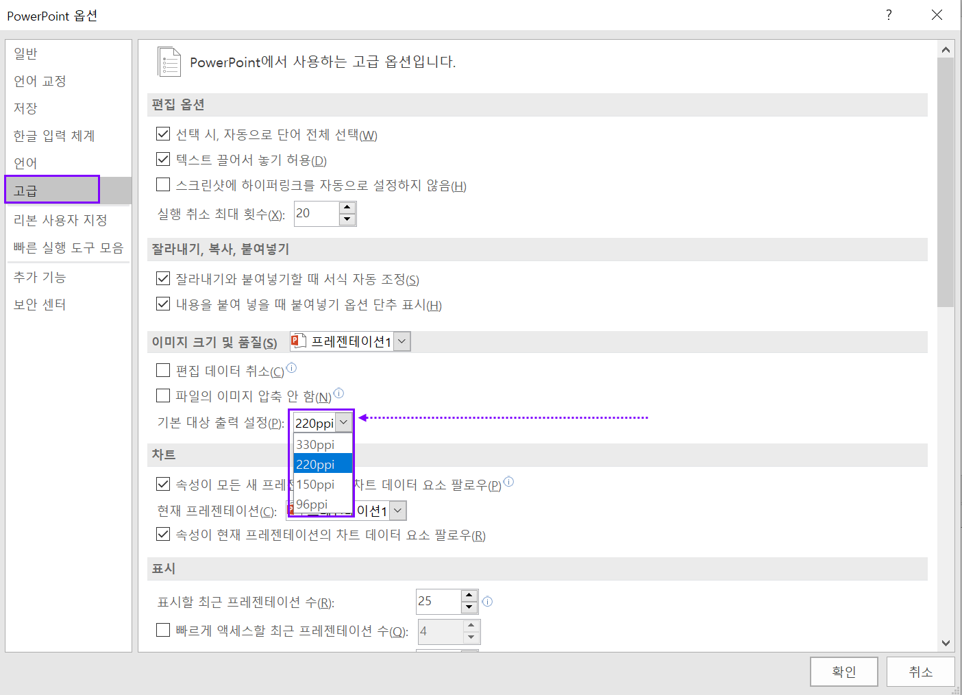 별도의 설정을 하지 않으면, 기본적으로 220ppi로 적용되며, 사용용도에 따라 150ppi 또는 96ppi로 PPT 용량을 줄일 수 있습니다.
