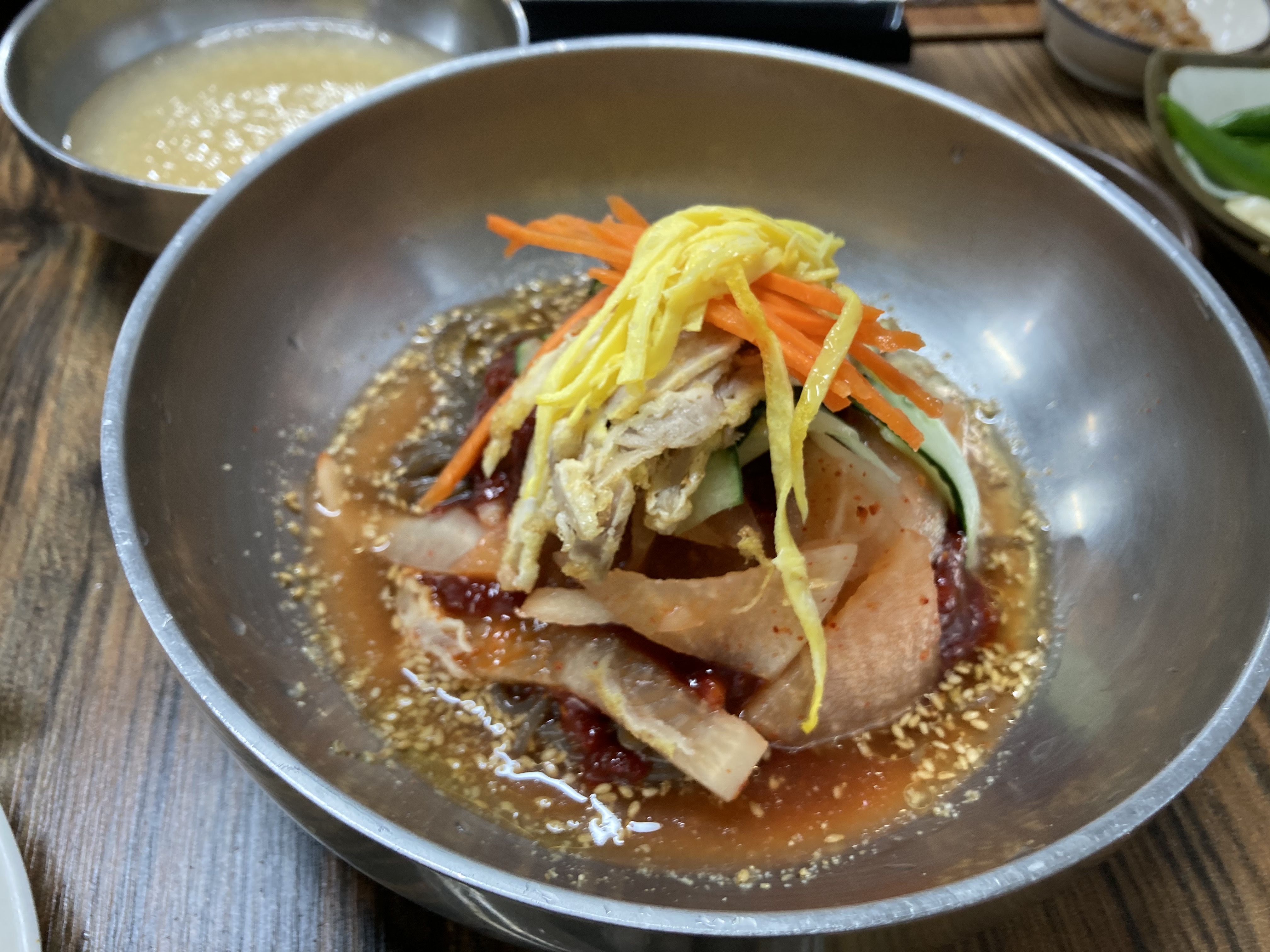 맛은 비빔냉면 맛이었어요! 근데 진주냉면이 유명한 거 아시나요? 진주냉면은 소고기 육전이 올라가는데, 여기 비빔막국수에도 육전이 올라간 진주냉면 스타일이에요.