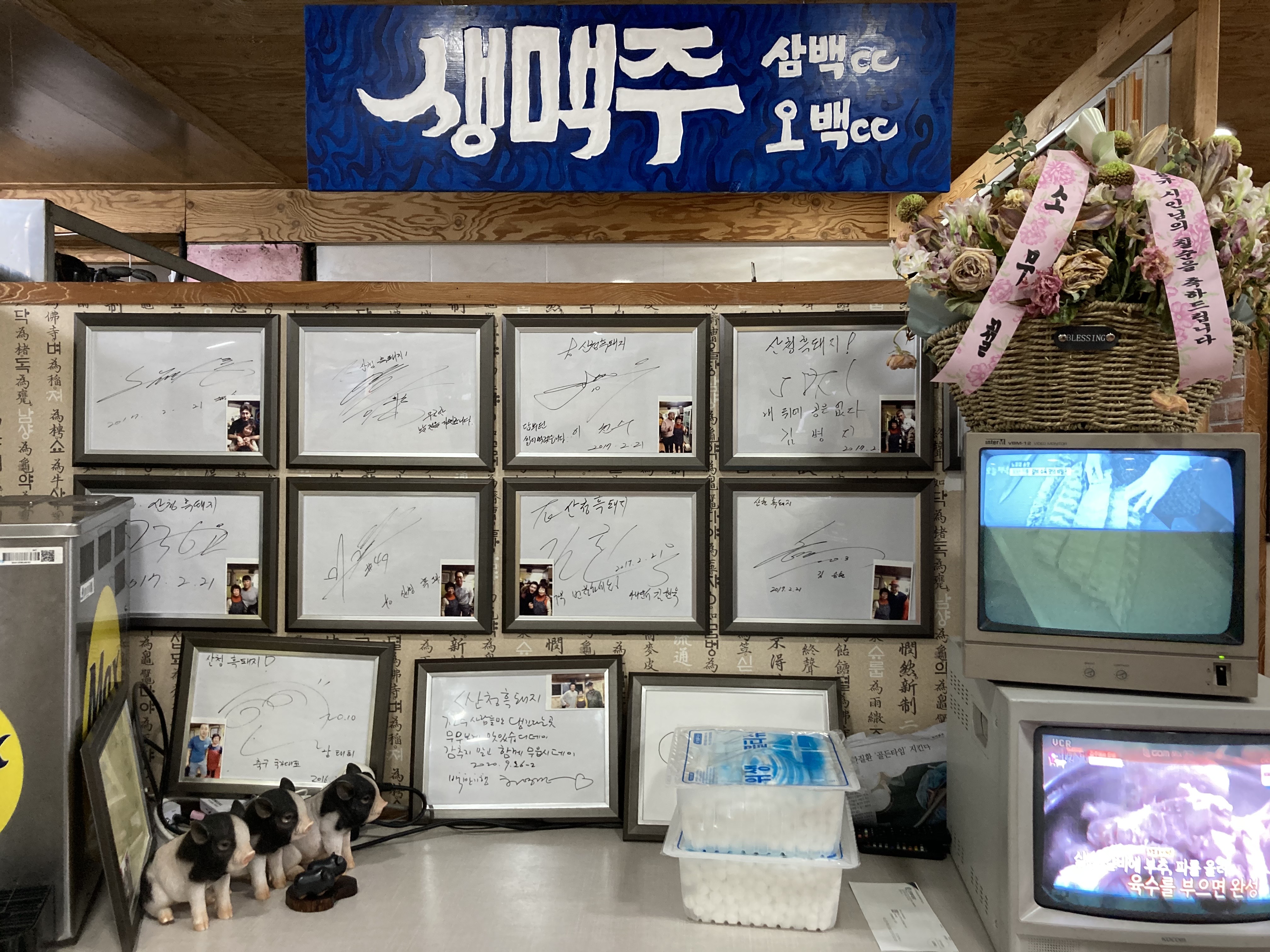 사장님이 축구 광팬이신지, 유명한 축구선수의 사인을 벽에 걸어놓으신 것 같았어요.