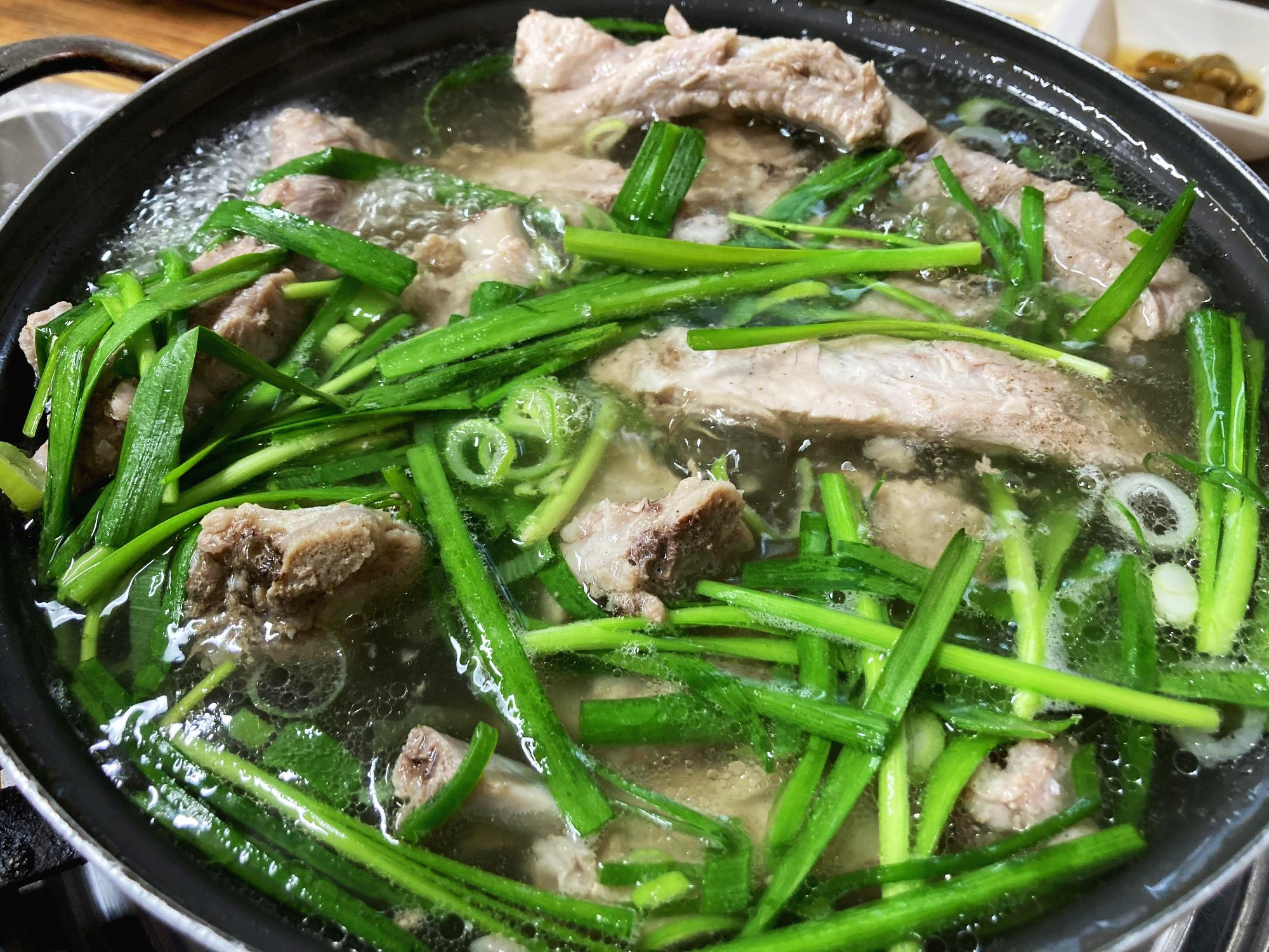 양이 진짜 많은데, 처음 나올 때 사진에는 안 담겨서 부추를 물에 풀어헤치고 다시 찍은 갈비 수육!