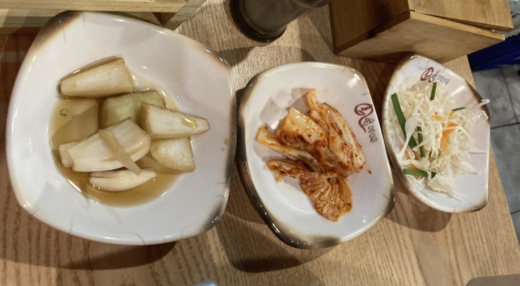 마늘장아찌와 김치, 샐러드! 마늘장아찌가 그냥 먹어도 맛있고 조개전골 먹고 칼국수랑 먹어도 너무 잘 어울렸어요~!