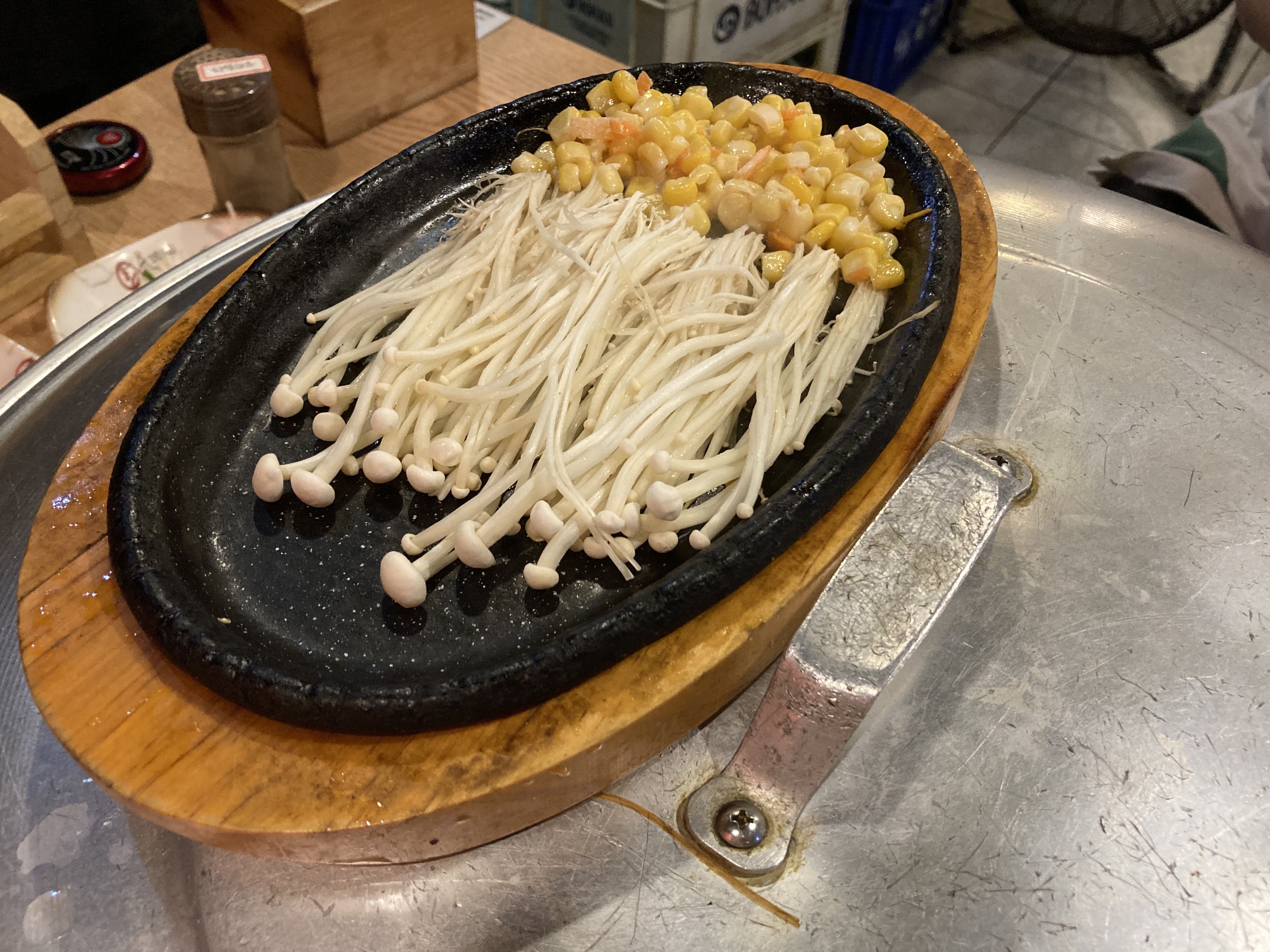 밑반찬으로 나오는 콘&팽이버섯 버터구이. 찜솥이 뜨겁다보니 저렇게 위에 올려주셨어요.