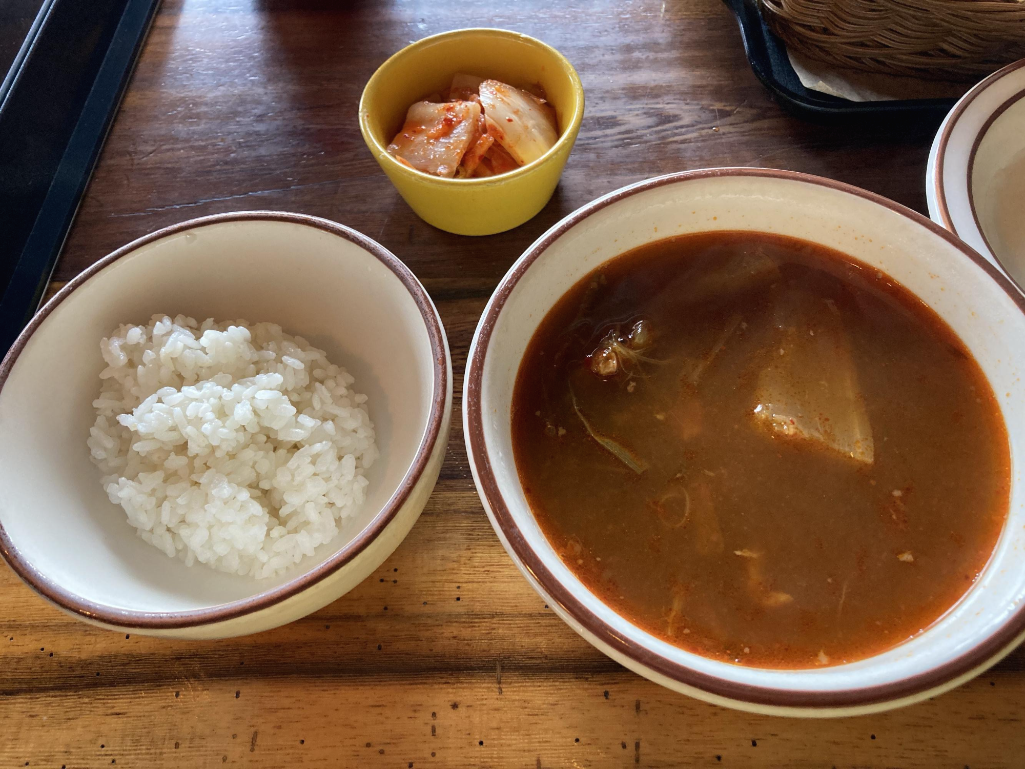 고기를 다 먹어가면 식사를 할지 물어보는데, 이렇게 육개장 스타일의 소고기무국과 밥, 김치가 나와요.
