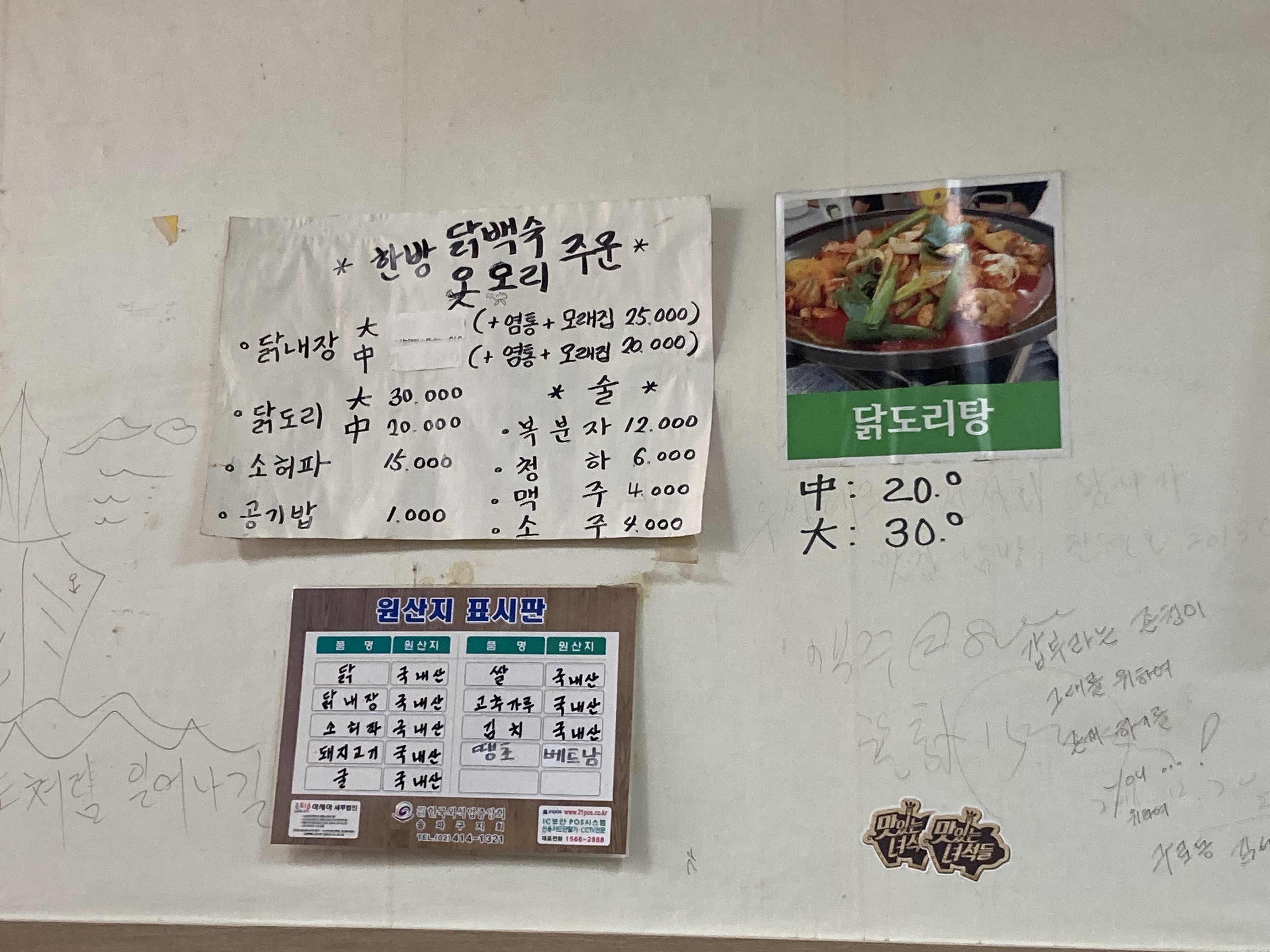 메뉴는 딱 3가지, 닭내장탕, 닭도리탕, 소허파 볶음이예요!