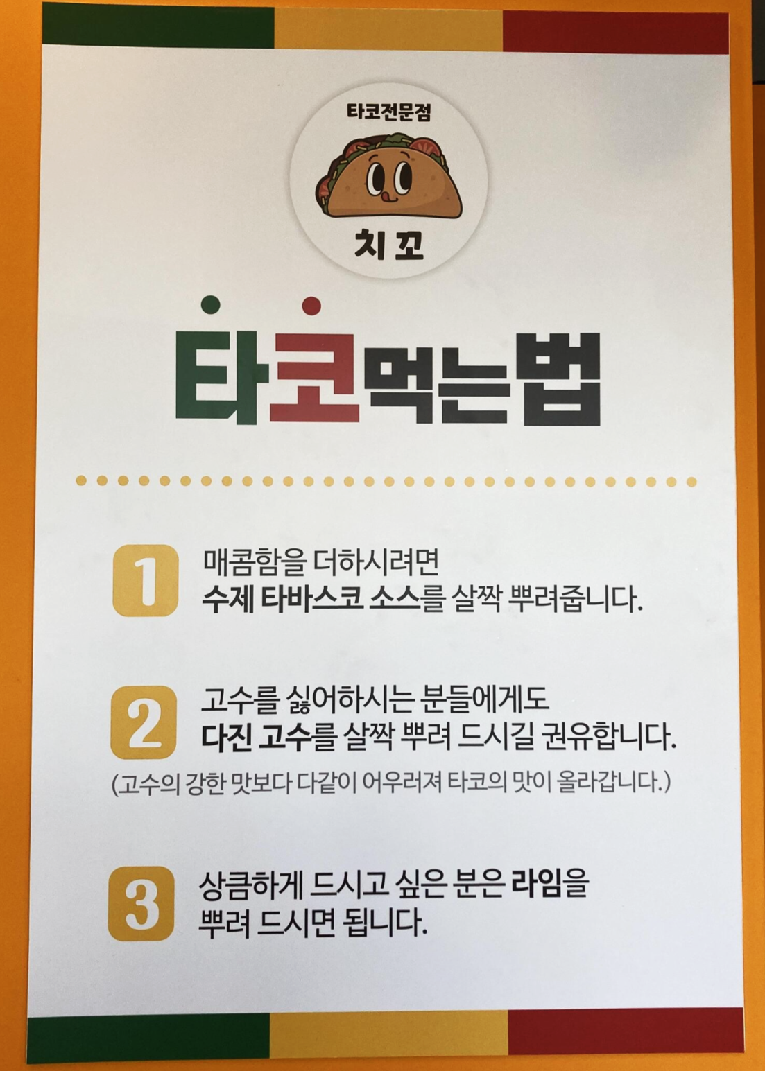 한 쪽 벽면에는 이렇게 타코 먹는 방법이 적혀있어요.