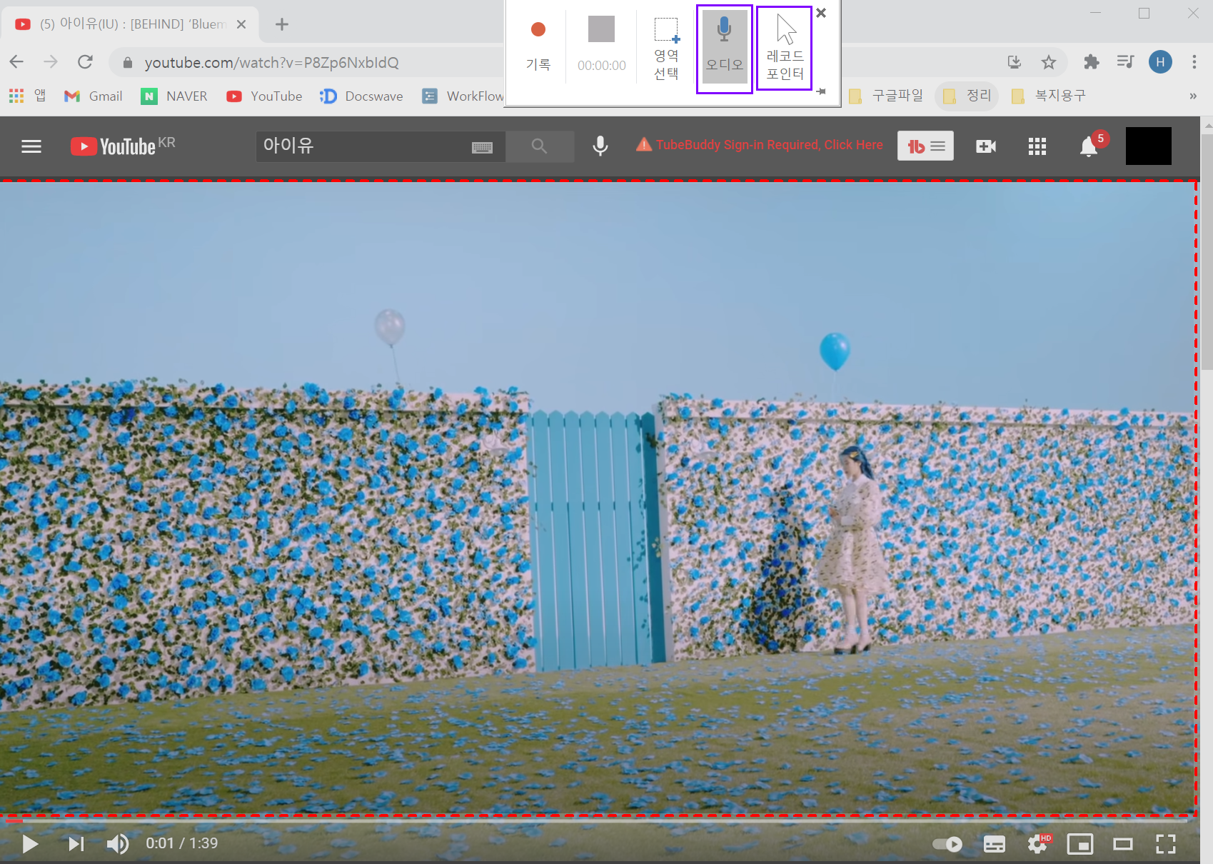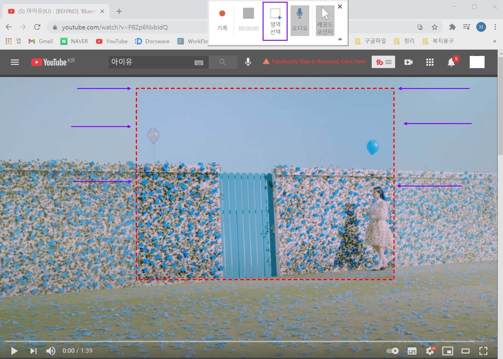 화면녹화를 클릭하면, 아래와 같은 화면이 뜹니다. 당황하지 말고 삽입하고자 하는 동영상 사이트로 가세요. 빨간 점선이 녹화될 화면입니다. 녹화할 화면을 맞추기 위해 상단에 있는 '영역 선택'을 클릭합니다.