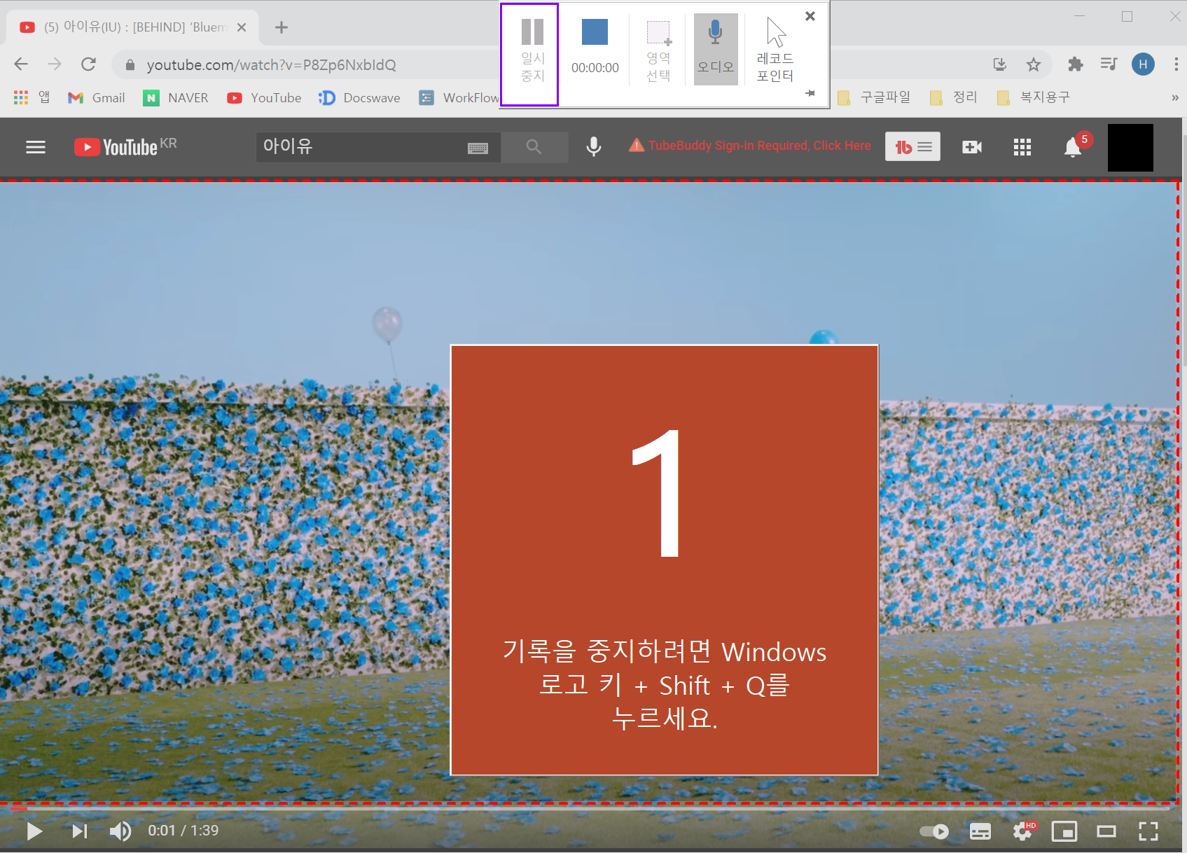 3-2-1 의 카운트 다운이 지나면 녹화가 시작되므로 1일 때, 동영상을 재생시키면 됩니다. 녹화를 중지하려면 Windows 로고 키 + Shift + Q를 동시에 누르세요.