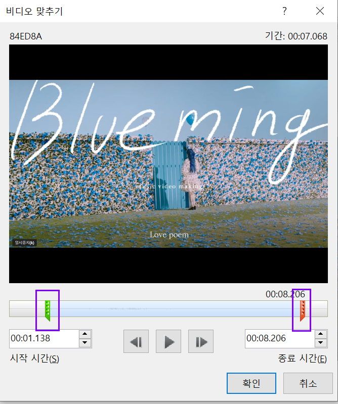 아래의 화면에서 좌측의 연두색을 원하는 영상의 시작 부분에 놓고, 우측의 빨간색을 영상 끝나는 부분에 두면 됩니다.