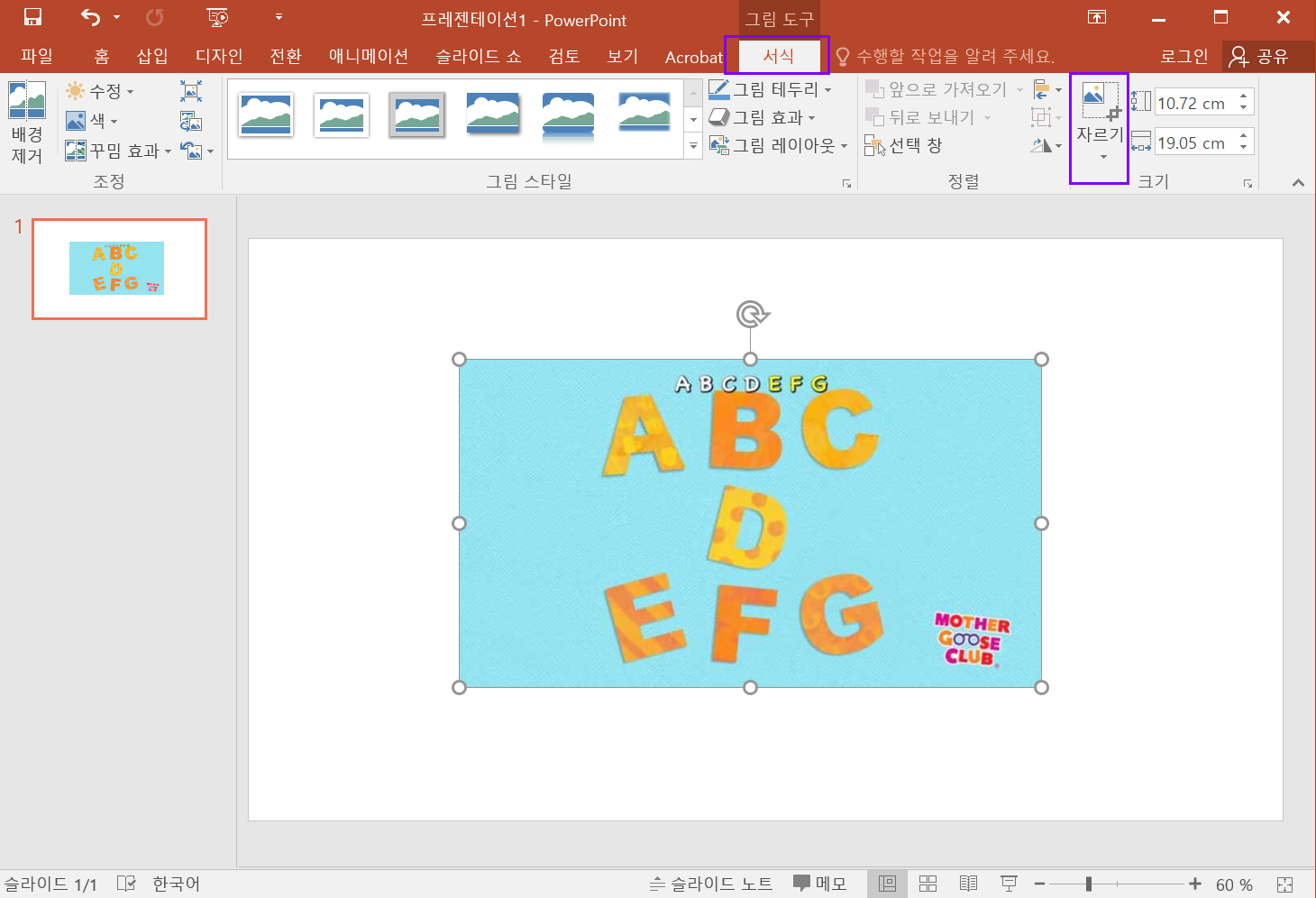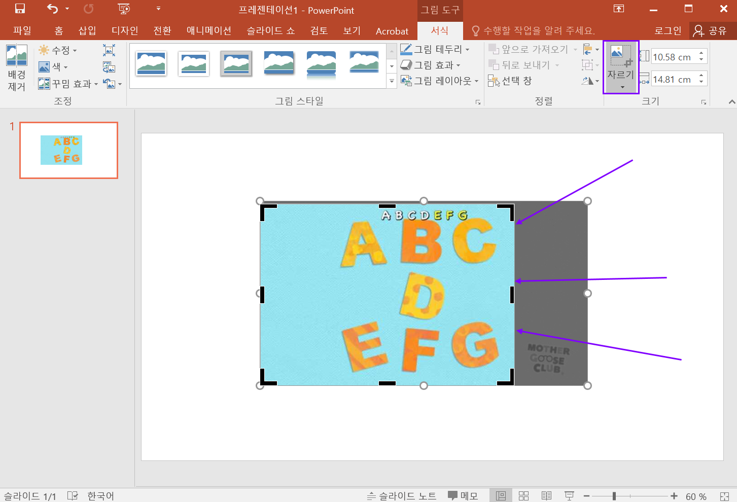 이미지 클릭 > 서식 > 자르기를 클릭합니다.
