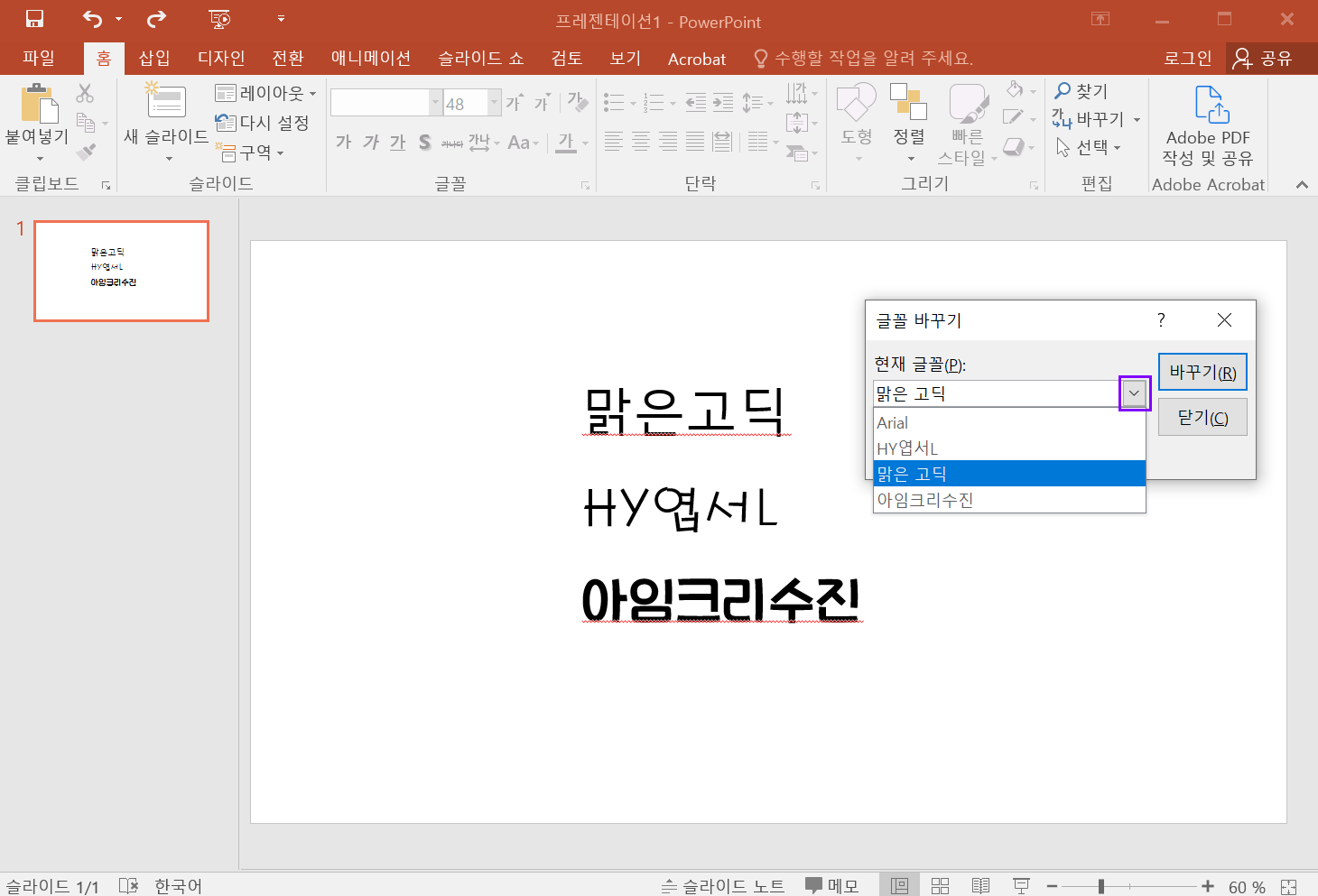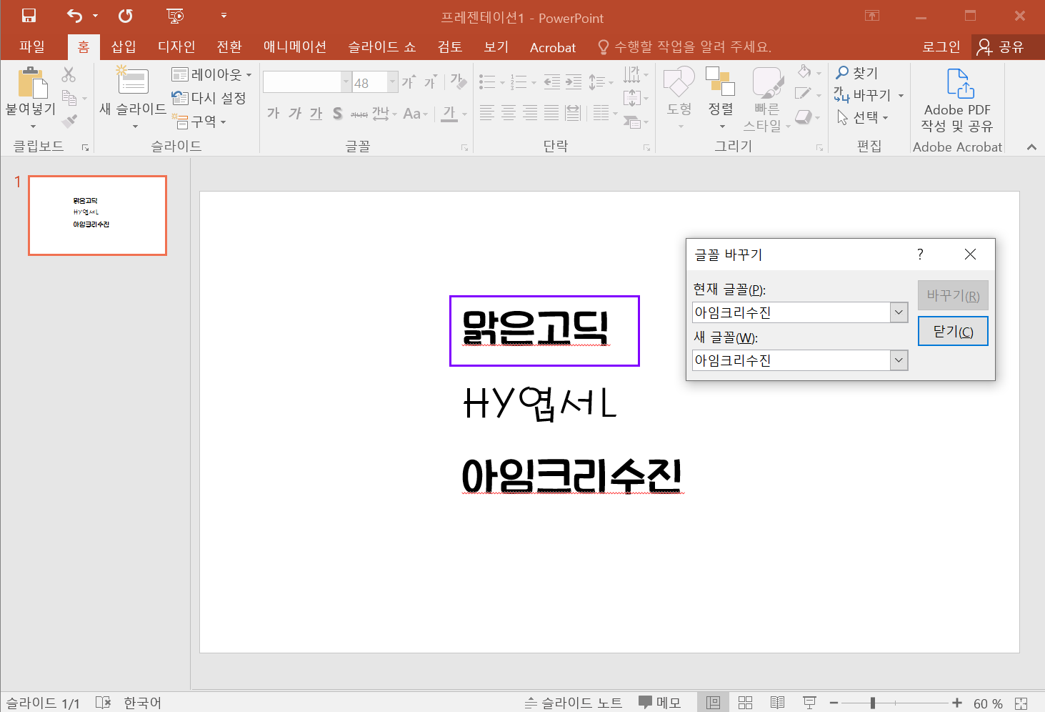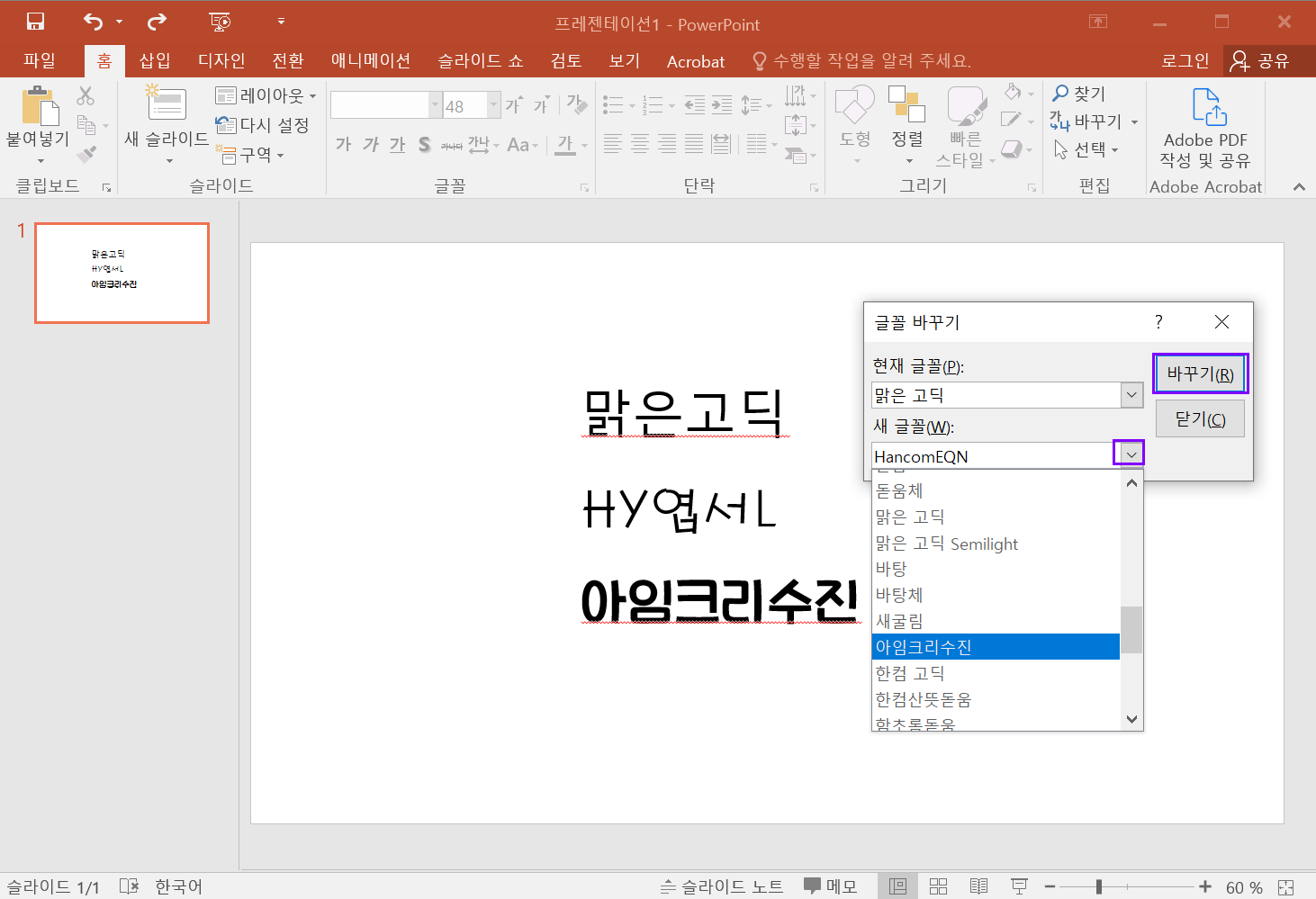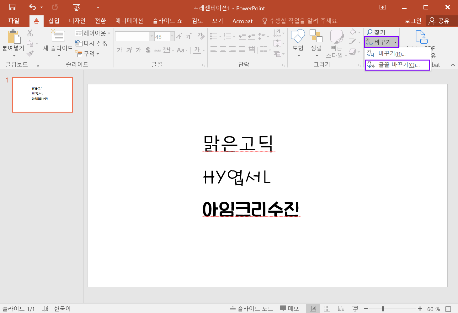 PPT에서 바꾸기 > 글꼴 바꾸기를 클릭합니다.