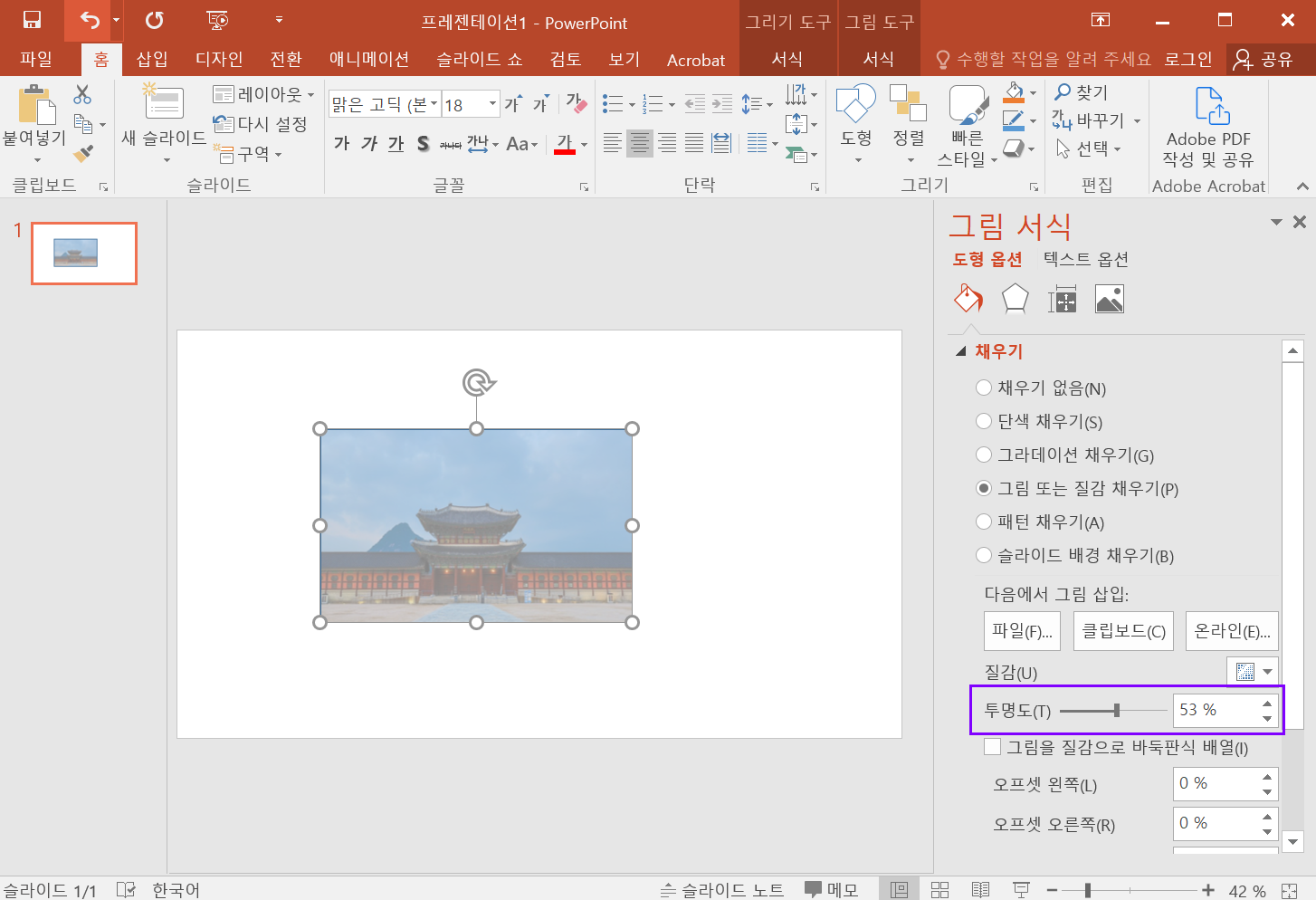 PPT에서 사진 투명도를 조절하는 방법은 2가지가 있습니다.